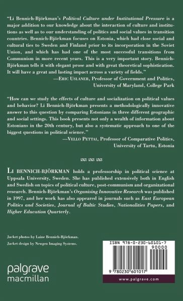 'Li Bennich-Björkman's Political Culture under Institutional Change is a major addition to our knowledge about the interaction of culture and institutions as well as to our understanding of politics and social values in transition countries. Bennich-Björkman focuses on Estonia, which had close social and cultural ties to Sweden and Finland prior to its incorporation in the Soviet Union, and which has had one of the most successful transitions from Communism in more recent years. This is a very important story. Bennich-Björkman tells it with elegant prose and with great theoretical sophistication. It will have a great and lasting impact across a variety of fields.' -Eric Uslaner, Professor of Government and Politics, University of Maryland, College Park, USA