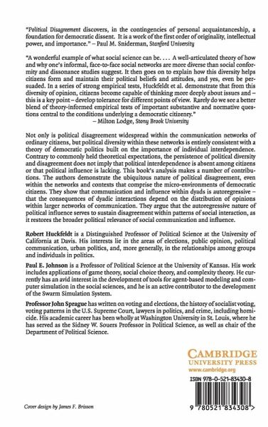 1. Communication influence and the capacity of citizens to disagree; 2. New information old information and persistent disagreement; 3. Dyads networks and autoregressive influence; 4. Disagreement heterogeneity and the effectiveness of political communication; 5. Disagreement heterogeneity and persuasion: how does disagreement survive?; 6. Agent-based explanations patterns of communication and the inevitability of homogeneity; 7. Agent-based explanations autoregressive influence and the survival of disagreement; 8. Heterogeneous networks and citizen capacity: disagreement ambivalence and engagement; 9. Summary implications and conclusion.