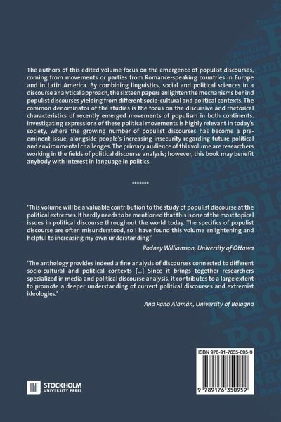 The authors of this edited volume focus on the emergence of populist discourses, coming from movements or parties from Romance-speaking countries in Europe and in Latin America. By combining linguistics, social and political sciences in a discourse analytical approach, the sixteen papers enlighten the mechanisms behind populist discourses yielding from different socio-cultural and political contexts. The common denominator of the studies is the focus on the discursive and rhetorical characteristics of recently emerged movements of populism in both continents. Investigating expressions of these political movements is highly relevant in today's society, where the growing number of populist discourses has become a preeminent issue, alongside people's increasing insecurity regarding future political and environmental challenges. The primary audience of this volume are researchers working in the fields of political discourse analysis; however, this book may benefit anybody with interest in language in politics.