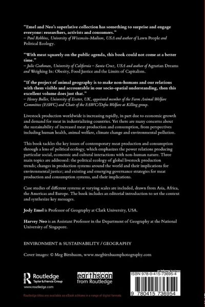 "In a world where food has become the focal point of environmental politics, it's high time for an unflinching survey of meat. From the economy of farmed fish and livestock genetics to the politics of rainforest ranching and Halal slaughter, Emel and Neo's superlative collection has something to surprise and engage everyone: researchers, activists and consumers." - Paul Robbins, Director of the Nelson Institute for Environmental Studies at the University of Wisconsin-Madison, USA and author of Lawn People and Political Ecology.
