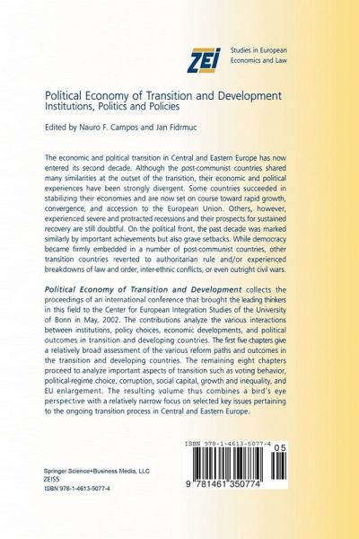 Political Economy of Transition and Development collects the proceedings of an international conference that brought the leading thinkers in this field to the Center for European Integration Studies of the University of Bonn in May, 2002. The contributions analyze the various interactions between institutions, policy choices, economic developments, and political outcomes in transition and developing countries. The first five chapters give a relatively broad assessment of the various reform paths and outcomes in the transition and developing countries. The remaining eight chapters proceed to analyze important aspects of transition such as voting behavior, political-regime choice, corruption, social capital, growth and inequality, and EU enlargement. The resulting volume thus combines a bird's eye perspective with a relatively narrow focus on selected key issues pertaining to the ongoing transition process in Central and Eastern Europe.