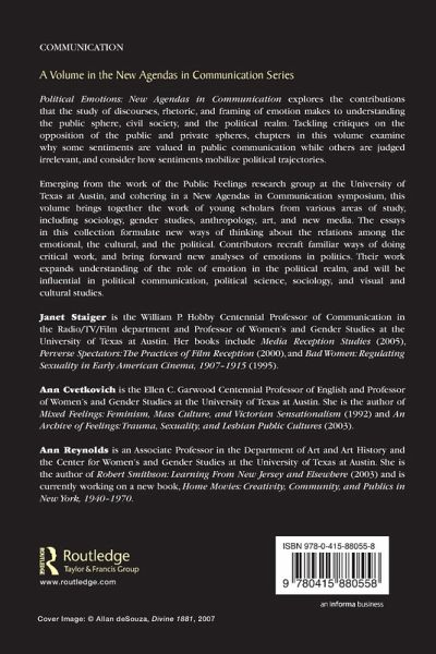 Emerging from the work of the Public Feelings research group at the University of Texas-Austin, and cohering in a New Agendas in Communication symposium, this volume brings together the work of young scholars from various areas of study, including sociology, gender studies, anthropology, art, and new media. The essays in this collection formulate new ways of thinking about the relations among the emotional, the cultural, and the political. Contributors recraft familiar ways of doing critical work, and bring forward new analyses of emotions in politics. Their work expands understanding of the role of emotion in the political realm, and will be influential in political communication, political science, sociology, and visual and cultural studies.