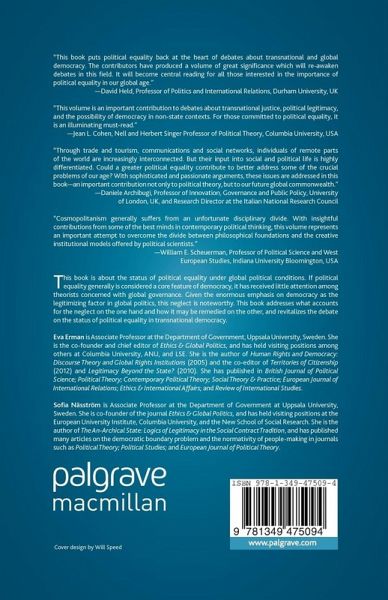 'This book puts political equality back at the heart of debates about transnational and global democracy. The contributors have produced a volume of great significance which will re-awaken debates in this field. It will become central reading for all those interested in the importance of political equality in our global age.' - David Held, Professor of Politics and International Relations, Durham University