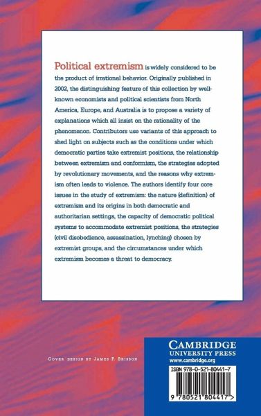 Political extremism is widely considered to be the product of irrational behavior. The distinguishing feature of this collection by well-known economists and political scientists from North America, Europe and Australia is to propose a variety of explanations which all insist on the rationality of extremism. Contributors use variants of this approach to shed light on subjects such as the conditions under which democratic parties take extremist positions, the relationship between extremism and conformism, the strategies adopted by revolutionary movements, and the reasons why extremism often leads to violence. The authors identify four core issues in the study of the phenomenon: the nature (definition) of extremism and its origins in both democratic and authoritarian settings, the capacity of democratic political systems to accommodate extremist positions, the strategies (civil disobedience, assassination, lynching) chosen by extremist groups, and the circumstances under which extremism becomes a threat to democracy.
