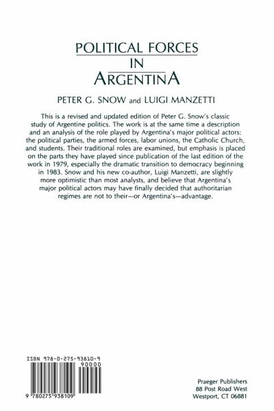 This is a revised and updated edition of Snow's classic study of Argentine politics. The work is a description and analysis of the role played by Argentina's major political actors: the political parties, the armed forces, labor unions, the Catholic Church, and students. Their traditional roles are examined, but emphasis is placed on the part they have played since publication of the last edition of the work in 1979, especially the dramatic transition to democracy beginning in 1983. Snow and his new co-author, Manzetti, are slightly more optimistic than most analysts, and believe that Argentina's major political actors may have finally decided that authoritarian regimes are not to their--nor Argentina's--advantage. Written primarily as a supplementary text for courses in Latin American politics, this work will be of interest to scholars and students of contemporary Latin America.