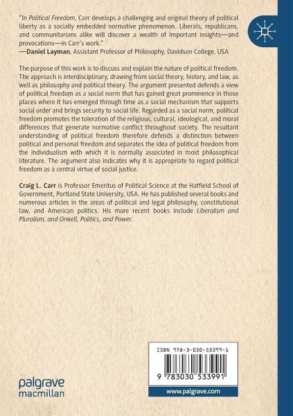 The purpose of this work is to discuss and explain the nature of political freedom. The approach is interdisciplinary, drawing from social theory, history, and law, as well as philosophy and political theory. The argument presented defends a view of political freedom as a social norm that has gained great prominence in those places where it has emerged through time as a social mechanism that supports social order and brings security to social life. Regarded as a social norm, political freedom promotes the toleration of the religious, cultural, ideological, and moral differences that generate normative conflict throughout society. The resultant understanding of political freedom therefore defends a distinction between political and personal freedom and separates the idea of political freedom from the individualism with which it is normally associated in most philosophical literature. The argument also indicates why it is appropriate to regard political freedom as a central virtue of social justice.