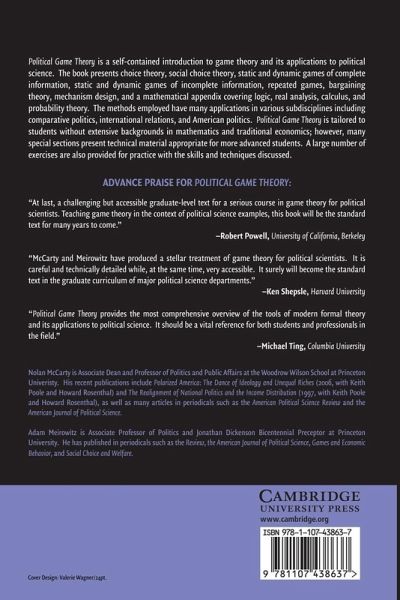 Political Game Theory is a self-contained introduction to game theory and its applications to political science. The book presents choice theory, social choice theory, static and dynamic games of complete information, static and dynamic games of incomplete information, repeated games, bargaining theory, mechanism design and a mathematical appendix covering, logic, real analysis, calculus and probability theory. The methods employed have many applications in various disciplines including comparative politics, international relations and American politics. Political Game Theory is tailored to students without extensive backgrounds in mathematics, and traditional economics, however there are also many special sections that present technical material that will appeal to more advanced students. A large number of exercises are also provided to practice the skills and techniques discussed.