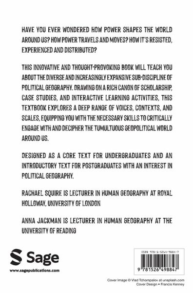 This innovative and thought-provoking text will teach you about the diverse and increasingly expansive sub-discipline of geopolitics. Divided into three sections, Political Geography draws on case studies from a diverse range of scales, contexts, and demographics, to introduce you to the key approaches, concepts, and futures of geopolitics. You will cover an extensive range of key topics in Political Geography, from feminist geopolitics to non-human worlds, and nationalism to peace and resistance. Throughout this first edition you will apply various theoretical lenses, utilise a wide range of examples both past and present, and draw on cutting edge scholarship to reinvigorate your understanding of important themes such as the state, borders, and territory. Based on the award-winning course at RHUL, Politcal Geography includes a variety of sites, spaces, materials, and images alongside 'In the field' tips, ideas for practical dissertation research, and tasks to facilitate active follow-on learning. Case studies, key terms, key questions and learning exercises, and annotated readings are included throughout every chapter to aid understanding and help you to engage and reflect on the content. Designed as a core text for undergraduates and an introductory text for postgraduates with an interest in Political Geography. Rachael Squire is lecturer in Human Geography at Royal Holloway University of London Anna Jackman is lecturer in Human Geography at University of Reading