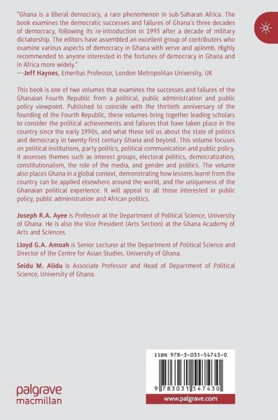 Chapter 1: Introduction: Structure, Agency, and Democratic Trappings in Ghana's Fourth Republic.- Chapter 2: Constitutional Provisions and Development: Are Indigenous Institutions Relevant?.- Chapter 3: Constitutional and Legal Challenges of Three Decades of the 1992 Constitution - Justification for Demands for Amendment.- Chapter 4: The Constitution of Ghana's Fourth Republic: Implications for Women's Representation in Politics.- Chapter 5: Plus ça change, plus c'est la même chose? Revisiting Dennis Austin's Politics in Ghana, 1946-1960, in the light of the Politics of the Fourth Republic.- Chapter 6: Electoral and Party Politics in Ghana's Fourth Republic: The Ramifications of a Duopoly.- Chapter 7: Political Parties and Democratic Consolidation in Ghana: The Struggles of Smaller Parties in an Institutionalized Two-party System.- Chapter 8: Inclusion and Exclusion in Ghana's Electoral Democracy: An Analysis of Voter Registrationand Turnout in Border Communities in Ghana.- Chapter 9: Interest Groups and the Passage of the Domestic Violence Act in Ghana: Insights from the Advocacy Coalition Framework.- Chapter 10: Resisting the System: Examining How Activist Chief Executive Officers (CEOs) Drive Positive Social Change in Ghana's Fourth Republic.- Chapter 11: Political Communication in an Emerging Democracy: A Framing Analysis of Presidential Inaugural Addresses in Ghana's Fourth Republic.- Chapter 12: Polls, Pundits and Religious Leaders: The Politics of Predicting Election Outcomes in Ghana's Fourth Republic.- Chapter 13: Media Pluralism, Regulators, and Transactional Instrumentalism in Ghana.- Chapter 14: Conclusion: Ghana Renascent? - Mapping a Path for the Future.