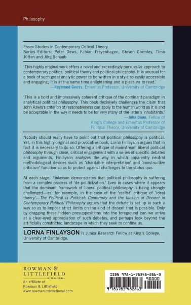Nobody should really have to point out that political philosophy is political. Yet in this highly original and provocative book Lorna Finlayson argues that in fact it is necessary to do so. Offering a critique of mainstream liberal political philosophy through close, critical engagement with a series of specific debates and arguments, Finlayson analyzes the way in which apparently neutral methodological devices such as "charitable interpretation" and "constructive criticism" function so as to protect against challenges to the status quo. At each stage, Finlayson demonstrates that political philosophy is suffering from a complex process of "de-politicization." Even in cases where it appears that the dominant framework of liberal political philosophy is being strongly challenged-as, for example, in the case of the 'realist' critique of "ideal theory"-this book argues that the debate is set up in such a way as to impose strict limits on the kind of dissent that is possible. Only by dragging these hidden presuppositions into the foreground can we arrive at a clear-eyed appreciation of such debates, and perhaps look beyond the artificially constricted landscape in which they seek to confine us.