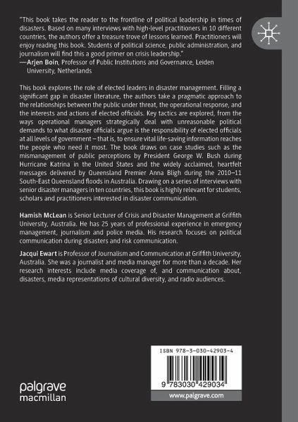 This book explores the role of elected leaders in disaster management. Filling a significant gap in disaster literature, the authors take a pragmatic approach to the relationships between the public under threat, the operational response, and the interests and actions of elected officials. Key tactics are explored, from the ways operational managers strategically deal with unreasonable political demands to what disaster officials argue is the responsibility of elected officials at all levels of government - that is, to ensure vital life-saving information reaches the people who need it most. The book draws on case studies such as the mismanagement of public perceptions by President George W. Bush during Hurricane Katrina in the United States and the widely acclaimed, heartfelt messages delivered by Queensland Premier Anna Bligh during the 2010-11 South-East Queensland floods in Australia. Drawing on a series of interviews with senior disaster managers in ten countries, this book is highly relevant for students, scholars and practitioners interested in disaster communication.