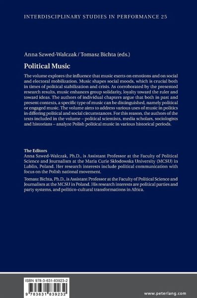 The volume explores the influence that music exerts on emotions and on social and electoral mobilization. Music shapes social moods, which is crucial both in times of political stabilization and crisis. As corroborated by the presented research results, music enhances group solidarity, loyalty toward the ruler and toward ideas. The authors of individual chapters argue that both in past and present contexts, a specific type of music can be distinguished, namely political or engaged music. The volume aims to address various uses of music in politics in differing political and social circumstances. For this reason, the authors of the texts included in the volume - political scientists, media scholars, sociologists and historians - analyze Polish political music in various historical periods.