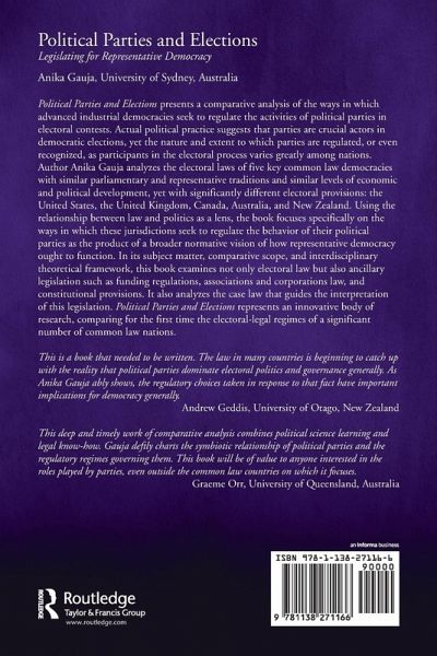 Political Parties and Elections presents a comparative analysis of the ways in which advanced industrial democracies seek to regulate the activities of political parties in electoral contests. Actual political practice suggests that parties are crucial actors in democratic elections, yet the nature and extent to which parties are regulated, or even recognized, as participants in the electoral process varies greatly among nations. Author Anika Gauja analyzes the electoral laws of five key common law democracies with similar parliamentary and representative traditions, similar levels of economic and political development, yet with significantly different electoral provisions: the United States, the United Kingdom, Canada, Australia, and New Zealand. Using the relationship between law and politics as a lens, the book focuses specifically on the ways in which these jurisdictions seek to regulate the behavior of their political parties as the product of a broader normative vision of how representative democracy ought to function. In its subject matter, comparative scope, and interdisciplinary theoretical framework, this book examines not only electoral law but also ancillary legislation such as funding regulations, associations and corporations law, and constitutional provisions. It also analyzes the case law that guides the interpretation of this legislation. Political Parties and Elections represents an innovative body of research, comparing for the first time the electoral-legal regimes of a significant number of common law nations.