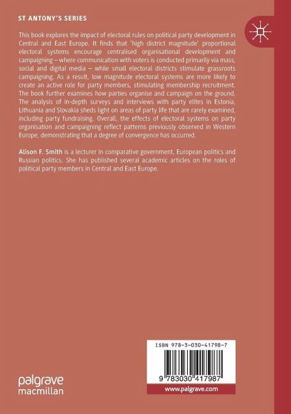 This book explores the impact of electoral rules on political party development in Central and East Europe. It finds that 'high district magnitude' proportional electoral systems encourage centralised organisational development and campaigning - where communication with voters is conducted primarily via mass, social and digital media - while small electoral districts stimulate grassroots campaigning. As a result, low magnitude electoral systems are more likely to create an active role for party members, stimulating membership recruitment. The book further examines how parties organise and campaign on the ground. The analysis of in-depth surveys and interviews with party elites in Estonia, Lithuania and Slovakia sheds light on areas of party life that are rarely examined, including party fundraising. Overall, the effects of electoral systems on party organisation and campaigning reflect patterns previously observed in Western Europe, demonstrating that a degree of convergence has occurred.