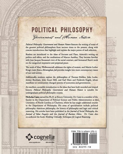 Political Philosophy: Government and Human Nature features the writing of some of the greatest political philosophers from ancient times to the present, along with concise introductions that highlight and explain the major points of each selection. Readers are introduced to the ideas of Socrates and Plato, Aristotle's writing on politics and ethics, and the meditations of Marcus Aurelius. They become familiar with Jean Jacques Rousseau's view of the social contract, and Immanuel Kant's work on the categorical imperative and perpetual peace. The work of Mary Wollstonecraft addresses the rights of women, and Martin Luther King's Letter from a Birmingham Jail provides insight into more contemporary issues of race and society. Additionally, students explore the philosophies of Thomas Hobbes, John Locke, Jeremy Bentham, John Stuart Mill, and Karl Marx and Frederick Engels, whose manifesto on communism changed systems of economics and governments. An excellent, accessible introduction to the ideas that have both recorded and shaped history, Political Philosophy: Government and Human Nature is suitable for undergraduate political philosophy courses.
