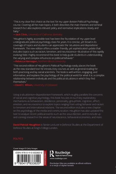 "What shapes political behavior more: the situations in which individuals find themselves, or the internal psychological makeup---beliefs, values, and so on---of those individuals? This is perhaps the leading division within the psychological study of politics today. Political Psychology: Situations, Individuals, and Cases, 2nd edition, provides a concise, readable, and conceptually organized introduction to the topic of political psychology by examining this very question. Using this situationism--dispositionism framework--which roughly parallels the concerns of social and cognitive psychology--this book focuses on such key explanatory mechanisms as behaviorism, obedience, personality, groupthink, cognition, affect, emotion, and neuroscience to explore topics ranging from voting behavior and racism to terrorism and international relations. The new edition includes a new chapter on the psychology of the media and communication. Houghton has also updated the text to analyze recent political events such asthe 2012 election, and to include up-and-coming research in the areas of neuroscience, behavioral economics, and more. Students and instructors will both benefit from the inclusion of new suggested readings, PowerPoints, and test banks available on the book's companion website. "--