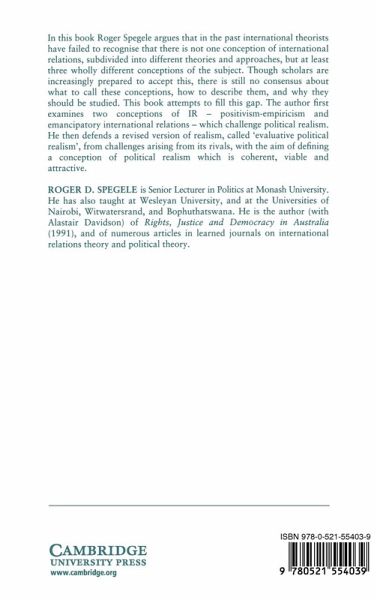In this 1996 book Roger Spegele argues that in the past international theorists have failed to recognise that there is not one conception of international relations, subdivided into different theories and approaches, but at least three wholly different conceptions of the subject. Though scholars are increasingly prepared to accept this, there is still no consensus about what to call these conceptions, how to describe them, and why they should be studied. This book attempts to fill this gap. The author first examines two conceptions of IR - positivism-empiricism and emancipatory international relations - which challenge political realism. He then defends a revised version of realism, called 'evaluative political realism', from challenges arising from its rivals, with the aim of defining a conception of political realism which is coherent, viable, and attractive.