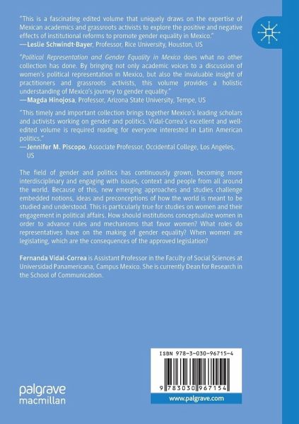 Part I: New Ideas and Approaches to Study Gender Equality.- Chapter 1. Introduction: Political Representation and Gender Equality in Mexico (Fernanda Vidal-Correa).- Chapter 2. The Politics of the Subject in the International Legal Framework that Protects Women's Political Rights (Juan Iván Martínez Ortega).- Chapter 3. Dialogic Feminisms: A methodological approach towards guaranteeing the rights articulated in constitutional regimes (Eunice Arias Arias).- Part II: Contesting Political Representation: Women's Substantive Representation in Mexico.- Chapter 4. A Gender Perspective or a Family Perspective: Exclusionary or inclusive frameworks (Diana Ibarra Soto).- Chapter 5. Building a Democracy with a Gender Perspective: Mexico's judicial path towards equality (Gema N. Morales Marti nez).- Chapter 6. Perspectives on Parity in Mexican Federal Legislators, 2009-2021: Gender, ideology and party affiliation (Monica Montaño Reyes and Cristian Márquez Romo).- Chapter 7. Women's SubstantiveRepresentation in Legal Bills: Classifying and applying them to the Mexican case (Sergio A. Bárcena Juárez, María Fernanda López Díaz de León and María José de la Peña Sánchez).- Chapter 8. Feminist Agendas and Substantive Equality: From the politics of presence to legislative political transformation (Lorena Vazquez Correa).- Chapter 9. Gender-based Political Violence: Regulatory demand and multilevel legislative harmonization in Mexico (Flavia Freidenberg and Karolina Gilas).- Part III: Contesting Women s Substantive Representation In Mexico: Grass-roots and Advocacy Communities Perspectives. Chapter 10 The Role of the Mexico City Congress in Advancing Gender Equality (Alicia Guadalupe Luna Salazar).- Chapter 11. Participation and Representation of Women's Demands during Indigenous Consultations: A study of the National REDD+ Strategy consultation processes in Puebla and Veracruz (Carolina Sthephania Muñoz Canto).- Chapter 12. Regulatory limitations for guaranteeing women an education free of violence: The case of the Action and Intervention Protocol against Gender-based Violence at the Autonomous University of Querétaro (Ana Karen Rodríguez Ballesteros).- Chapter 13. Transnational policy transfer and the gender-based violence agenda: Contributions from civil society (Adriana Ortiz Ortega and Anel Ortiz).- Chapter 14. The Olimpia Law: The beginning of a legal framework that addresses digital violence (Laura Vidal).