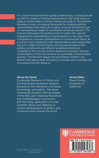 It is uncontroversial that the quality of democracy is closely bound up with the quality of political representation. But what exactly is political representation and how should we study it? This Element develops a novel conceptual framework for studying political representation that makes the insights of recent theoretical work on representation usable for quantitative empirical research. The theoretical literature the authors build on makes the case for changing the understanding of representation in two ways. First, it proposes to conceive representation in constructivist terms, as a practice that is shaped by both representatives and represented. Second, it treats communicative acts by representatives that address constituents and different analytical dimensions contained in them as the central categories of analysis; political representation is thus conceived as an essentially communicative practice. This Element argues that quantitative research can benefit from taking these innovations seriously, and it provides the conceptual tools for doing so.