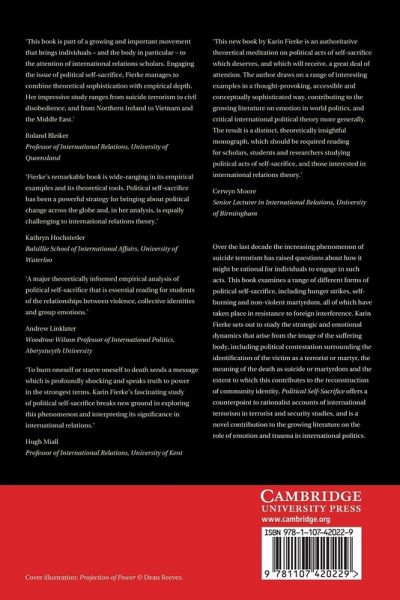 Over the last decade the increasing phenomenon of suicide terrorism has raised questions about how it might be rational for individuals to engage in such acts. This book examines a range of different forms of political self-sacrifice, including hunger strikes, self-burning and non-violent martyrdom, all of which have taken place in resistance to foreign interference. Karin Fierke sets out to study the strategic and emotional dynamics that arise from the image of the suffering body, including political contestation surrounding the identification of the victim as a terrorist or martyr, the meaning of the death as suicide or martyrdom and the extent to which this contributes to the reconstruction of community identity. Political Self-Sacrifice offers a counterpoint to rationalist accounts of international terrorism in terrorist and security studies, and is a novel contribution to the growing literature on the role of emotion and trauma in international politics.