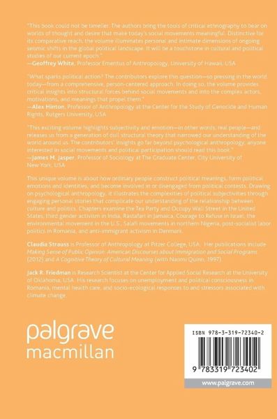 This unique volume is about how ordinary people construct political meanings, form political emotions and identities, and become involved in or disengaged from political contests. Drawing on psychological anthropology, it illustrates the complexities of political subjectivities through engaging personal stories that complicate our understanding of the relationship between culture and politics. Chapters examine the Tea Party and Occupy Wall Street in the United States, third gender activism in India, Rastafari in Jamaica, Courage to Refuse in Israel, the environmental movement in the U.S., Salafi movements in northern Nigeria, post-socialist labor politics in Romania, and anti-immigrant activism in Denmark.