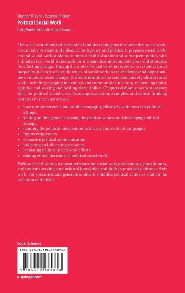 This social work book is the first of its kind, describing practical steps that social workers can take to shape and influence both policy and politics. It prepares social workers and social work students to impact political action and subsequent policy, with a detailed real-world framework for turning ideas into concrete goals and strategies for effecting change. Tracing the roots of social work in response to systemic social inequality, it clearly relates the tenets of social work to the challenges and opportunities of modern social change. The book identifies the core domains of political social work, including engaging individuals and communities in voting, influencing policy agendas, and seeking and holding elected office. Chapters elaborate on the necessary skills for political social work, featuring discussion, examples, and critical thinking exercises in such vital areas as: