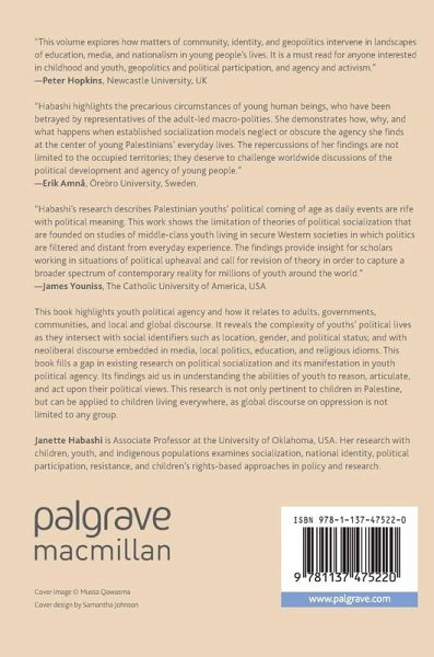 This book increases the awareness of youth political agency and how it relates to adults, governments, communities, and local and global discourse. It reveals the complexity of youth's political lives as it intersects with social identifiers such as location, gender, and political status, and interacts with neoliberal discourse embedded in media, local politics, education, and religious idioms. This book fills a gap in existing research to provide a body of literature on the political socialization and its manifestation in youth political agency. The research findings aid in understanding the abilities of youth to reason, reflect upon, articulate, and act upon their political views. This research is not only pertinent to children in Palestine, but can also be applied to children living everywhere as global discourse of oppression is not limited to a location, age or a group.