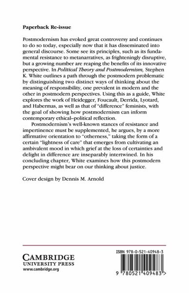 In Political Theory and Postmodernism, Stephen K. White outlines a path through the postmodern problematic by distinguishing two distinct ways of thinking about the meaning of responsibility, one prevalent in modern and the other in postmodern perspectives.