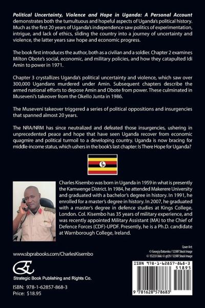 Political Uncertainty, Violence and Hope in Uganda: A Personal Account demonstrates both the tumultuous and hopeful aspects of Uganda's political history. Much as the first 20 years of Uganda's independence saw politics of experimentation, intrigue, and lack of ethics, sliding the country into a journey of uncertainty and violence, the latter years saw hope and economic progress. The book first introduces the author, both as a civilian and a soldier. Chapter 2 examines Milton Obote's social, economic, and military policies, and how they catapulted Idi Amin to power in 1971. Chapter 3 crystallizes Uganda's political uncertainty and violence, which saw over 300,000 Ugandans murdered under Amin. Subsequent chapters describe the armed national efforts to depose Amin and Obote from power. These culminated in Museveni's takeover from the Okello Junta in 1986. The Museveni takeover triggered a series of political oppositions and insurgencies that spanned almost 20 years. The NRA/NRM has since neutralized and defeated those insurgencies, ushering in unprecedented peace and hope that have seen Uganda recover from economic quagmire and political turmoil to a developing country. Uganda is now bracing for middle-income status, which ushers in the book's last chapter: Is There Hope for Uganda? (About the Author) Charles Kisembo was born in Uganda in 1959 in what is presently the Kamwenge District. In 1984, he attended Makerere University and graduated with a bachelor's degree in history. In 1991, he enrolled for a master's degree in history. In 2007, he graduated with a master's degree in defence studies at Kings College, London. Col. Kisembo has 35 years of military experience, and was recently appointed Military Assistant (MA) to the Chief of Defence Forces (CDF)-UPDF. Presently, he is a Ph.D. candidate at Warnborough College, Ireland.