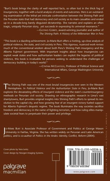 "This book is a dazzling achievement. Jo-Marie Burt offers a riveting, up-close analysis of political violence, the state, and civil society in Peru. This rigorous, nuanced work revises much of the conventional wisdom about both Peru's Shining Path insurgency and the Alberto Fujimori government. With important insights about how insurgencies can exploit weak states and how authoritarian leaders can exploit the legacies of political violence, this book is invaluable for persons seeking to understand the challenges of democracy building in today's world." - Cynthia McClintock, Professor of Political Science and International Affairs, George Washington University