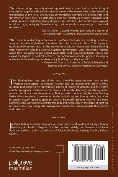"This book is a dazzling achievement. Jo-Marie Burt offers a riveting, up-close analysis of political violence, the state, and civil society in Peru. This rigorous, nuanced work revises much of the conventional wisdom about both Peru's Shining Path insurgency and the Alberto Fujimori government. With important insights about how insurgencies can exploit weak states and how authoritarian leaders can exploit the legacies of political violence, this book is invaluable for persons seeking to understand the challenges of democracy building in today's world." - Cynthia McClintock, Professor of Political Science and International Affairs, George Washington University