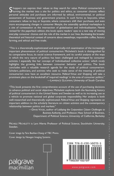 'This is a theoretically-sophisticated and empirically-rich examination of the increasingly important phenomenon of political consumerism. Micheletti's book is distinguished by its comparative focus, its social science framework, and its careful analysis of the ways in which the very nature of politics has been challenged and reshaped by consumer activists. I especially like her concept of 'individualized collective action,' which nicely highlights the growing links between consumer behavior and politics. The book concludes with a valuable research agenda for the study of political consumerism. Scholars, politicians, and activists who seek to make sense of the meaning of political consumerism now have an excellent resource. Political Virtue and Shopping will take a prominent place on the bookshelf of 'required readings' in the area of consumer politics.' - Lawrence Glickman, University of South Carolina, USA