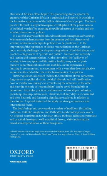 How does Christian ethics begin? This pioneering study explores the grammar of the Christian life as it is embodied and learned in worship as the formative experience of Christian communities. In a careful analysis of biblical and traditional conceptions of worship, Wannenwetsch demonstrates how worship challenges the deepest antagonisms in political thought and social practice. Particular worship practices (confession, preaching, praising, intercession, observance of holy days) are examined and their ethical and political significance is explored.