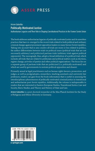 The book addresses authoritarian legacies of politically motivated justice and its unwritten practices that have re-emerged in the recent trials related to both political and ordinary criminal charges against prominent opposition leaders in many former Soviet republics. Taking into account that in any country all trials are more or less related to politics, the author differentiates between trials on political issues (political trials that are not necessarily arbitrary) and politicized partisan trials (arbitrary trials against political opponents). The monograph, thus, adopts a broad definition of a political trial, which includes all trials that are related to politicians and political matters such as elections, regime change, activities of parties and other political organizations. The focus lies on a separate group of partisan trials that are politicized (i.e. politically motivated) and which are used by governments to restrain political opposition and dissent.