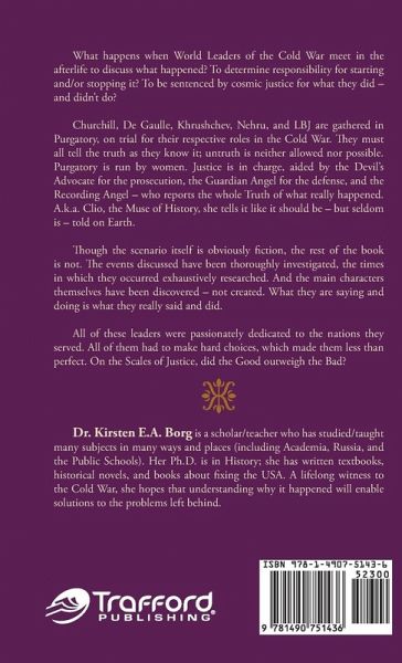 What happens when world leaders of the Cold War meet in the afterlife to discuss what happened? To determine responsibility for starting and/or stopping it? To be sentenced by cosmic justice for what they did and didn't do? Churchill, De Gaulle, Khrushchev, Nehru, and LBJ are gathered in purgatory, on trial for their respective roles in the Cold War. They must all tell the truth as they know it; untruth is neither allowed nor possible. Purgatory is run by women. Justice is in charge, aided by the devil's advocate for the prosecution, the guardian angel for the defense, and the recording angel-who reports the whole truth of what really happened-a.k.a. Clio, the muse of history. She tells it like it should be, but seldom is told on Earth. Though the scenario itself is obviously fiction, the rest of the book is not. The events discussed have been thoroughly investigated, and the times in which they occurred exhaustively researched. And the main characters themselves have been discovered, not created. What they are saying and doing is what they really said and did. All these leaders were passionately dedicated to the nations they served. All of them had to make hard choices, which made them less than perfect. On the scales of justice, did the good outweigh the bad?