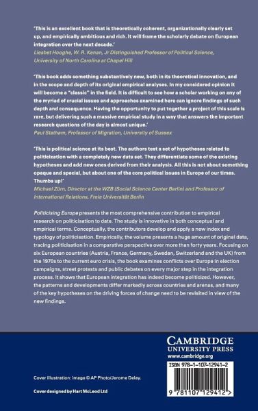 Politicising Europe presents the most comprehensive contribution to empirical research on politicisation to date. The study is innovative in both conceptual and empirical terms. Conceptually, the contributors develop and apply a new index and typology of politicisation. Empirically, the volume presents a huge amount of original data, tracing politicisation in a comparative perspective over more than forty years. Focusing on six European countries (Austria, France, Germany, Sweden, Switzerland and the UK) from the 1970s to the current euro crisis, the book examines conflicts over Europe in election campaigns, street protests, and public debates on every major step in the integration process. It shows that European integration has indeed become politicised. However, the patterns and developments differ markedly across countries and arenas, and many of the key hypotheses on the driving forces of change need to be revisited in view of new findings.