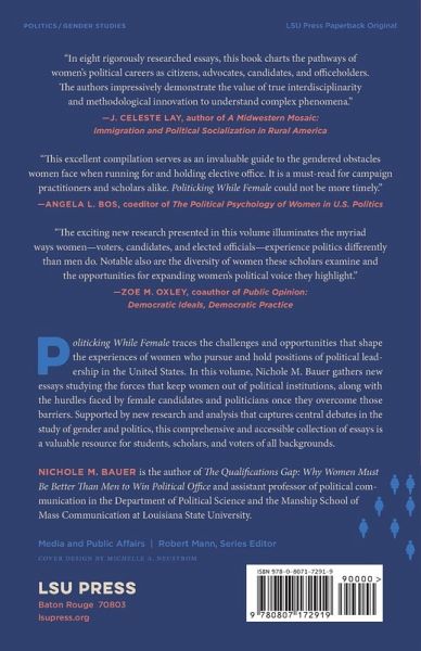 Politicking While Female traces the challenges and opportunities that shape the experiences of women who pursue and hold positions of political leadership in the United States. In this volume, Nichole M. Bauer gathers new essays studying the forces that keep women out of political institutions, along with the hurdles faced by female candidates and politicians once they overcome those barriers. Drawing on recent, original data, Politicking While Female examines the life cycle of a woman's political career. The first section charts the development of political identities that shape women's participation in politics as voters and as potential candidates, with attention to the patterns of socialization that can discourage women from seeing themselves as political leaders. The next two sections focus on the process of deciding to run for public office, especially the crucial role of mentors, and the challenges female candidates face when campaigning, as they work to raise money, develop effective messages, and overcome voter biases regarding women in leadership roles. The final section explores how women govern once in office, showing the impact of having larger numbers of women in positions of political power. A valuable resource for students, scholars, and voters of all backgrounds, Politicking While Female: The Political Lives of Women offers a comprehensive and accessible collection of essays, supported by new research and analysis, that captures central debates in the study of gender and politics.