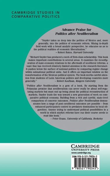 The shift from state-led to market-oriented, neoliberal economic policies has been one of the most important changes in the developing world during the last two decades. Although much existing research has focused on why countries choose these neoliberal policy reforms and how they implement them, Richard Snyder's study offers an analysis of politics after neoliberalism. The book proposes a framework that explains how neoliberal reforms, rather than unleashing market forces, actually trigger 're-regulation' processes involving strategic interactions between political entrepreneurs and societal groups. Depending on the strengths and strategies of politicians and societal groups, reregulation results in different types of new institutions for market governance with contrasting consequences for economic efficiency and social justice. This framework is used in conjunction with an innovative subnational comparative method to analyze evidence from four Mexican states about the politics of reregulation.
