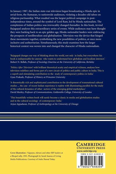 Winner of the 2003 Ananda Kentish Coomaraswamy Book Prize In January 1987, the Indian state-run television began broadcasting a Hindu epic in serial form, the Ramayan, to nationwide audiences, violating a decades-old taboo on religious partisanship. What resulted was the largest political campaign in post-independence times, around the symbol of Lord Ram, led by Hindu nationalists. The complexion of Indian politics was irrevocably changed thereafter. In this book, Arvind Rajagopal analyses this extraordinary series of events. While audiences may have thought they were harking back to an epic golden age, Hindu nationalist leaders were embracing the prospects of neoliberalism and globalisation. Television was the device that hinged these movements together, symbolising the new possibilities of politics, at once more inclusive and authoritarian. Simultaneously, this study examines how the larger historical context was woven into and changed the character of Hindu nationalism.