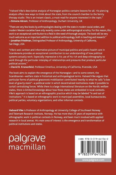 The book aims to explain the emergence of the Norwegian-and to some extent, the Scandinavian-welfare state in historical and anthropological terms. Halvard Vike argues that particular forms of political grassroots mobilization contributed heavily to what he calls "a low level of gravity state"-a political order in which decentralized institutions make it possible to curtail centralizing forces. While there is a large international literature on the Nordic welfare states, there is limited knowledge about how these states are embedded in local contexts. Vike's approach is based on an ethnographic practice which may be labeled "in and out of institutions." It is based on ethnographic work in municipal assemblies, local bureaucracies, political parties, voluntary organizations, and various informal contexts.