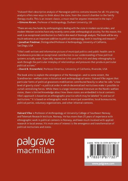 The book aims to explain the emergence of the Norwegian-and to some extent, the Scandinavian-welfare state in historical and anthropological terms. Halvard Vike argues that particular forms of political grassroots mobilization contributed heavily to what he calls "a low level of gravity state"-a political order in which decentralized institutions make it possible to curtail centralizing forces. While there is a large international literature on the Nordic welfare states, there is limited knowledge about how these states are embedded in local contexts. Vike's approach is based on an ethnographic practice which may be labeled "in and out of institutions." It is based on ethnographic work in municipal assemblies, local bureaucracies, political parties, voluntary organizations, and various informal contexts.