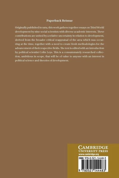 Originally published in 1969, this work gathers together essays on Third World development by nine social scientists with diverse academic interests. These contributions are united by a relative uncertainty in relation to development, derived from the broader critical reappraisal of the area which was occurring at the time, together with a need to create fresh methodologies for the advancement of their respective fields. The text is edited with an introduction by political scientist Colin Leys. This is a consummately researched collection, ambitious in scope, that will be of value to anyone with an interest in political science and theories of development.