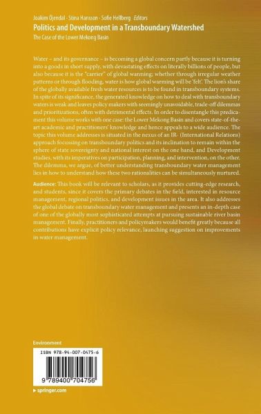 Water - and its governance - is becoming a global concern partly because it is turning into a goods in short supply, with devastating effects on literally billions of people, but also because it is the "carrier" of global warming; whether through irregular weather patterns or through flooding, water is how global warming will be 'felt'. The lion's share of the globally available fresh water resources is to be found in transboundary systems. In spite of its significance, the generated knowledge on how to deal with transboundary waters is weak and leaves policy makers with seemingly unavoidable, trade-off dilemmas and prioritizations, often with detrimental effects. In order to disentangle this predicament this volume works with one case: the Lower Mekong Basin and covers state-of-the-art academic and practitioners' knowledge and hence appeals to a wide audience. The topic this volume addresses is situated in the nexus of an IR- (International Relations) approach focussing on transboundary politics and its inclination to remain within the sphere of state sovereignty and national interest on the one hand, and Development studies, with its imperatives on participation, planning, and intervention, on the other. The dilemma, we argue, of better understanding transboundary water management lies in how to understand how these two rationalities can be simultaneously nurtured.