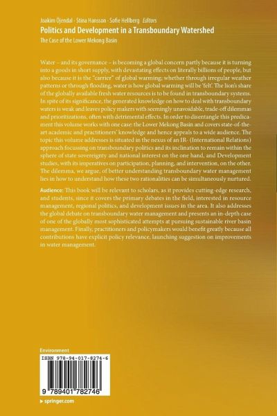 Water - and its governance - is becoming a global concern partly because it is turning into a goods in short supply, with devastating effects on literally billions of people, but also because it is the "carrier" of global warming; whether through irregular weather patterns or through flooding, water is how global warming will be 'felt'. The lion's share of the globally available fresh water resources is to be found in transboundary systems. In spite of its significance, the generated knowledge on how to deal with transboundary waters is weak and leaves policy makers with seemingly unavoidable, trade-off dilemmas and prioritizations, often with detrimental effects. In order to disentangle this predicament this volume works with one case: the Lower Mekong Basin and covers state-of-the-art academic and practitioners' knowledge and hence appeals to a wide audience. The topic this volume addresses is situated in the nexus of an IR- (International Relations) approach focussing on transboundary politics and its inclination to remain within the sphere of state sovereignty and national interest on the one hand, and Development studies, with its imperatives on participation, planning, and intervention, on the other. The dilemma, we argue, of better understanding transboundary water management lies in how to understand how these two rationalities can be simultaneously nurtured.