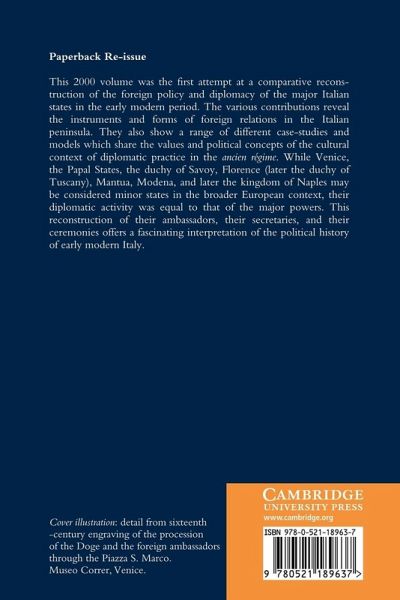This 2000 volume was the first attempt at a comparative reconstruction of the foreign policy and diplomacy of the major Italian states in the early modern period. The various contributions reveal the instruments and forms of foreign relations in the Italian peninsula. They also show a range of different case-studies and models which share the values and political concepts of the cultural context of diplomatic practice in the ancien régime. While Venice, the Papal States, the duchy of Savoy, Florence (later the duchy of Tuscany), Mantua, Modena, and later the kingdom of Naples may be considered minor states in the broader European context, their diplomatic activity was equal to that of the major powers. This reconstruction of their ambassadors, their secretaries, and their ceremonies offers a fascinating interpretation of the political history of early modern Italy.