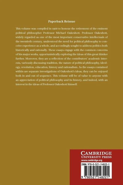 This volume was compiled in 1968 to honour the retirement of the eminent political philosopher Professor Michael Oakeshott. Professor Oakeshott, widely regarded as one of the most important conservative intellectuals of the twentieth century, understood the need for political philosophy to conceive experience as a whole, and accordingly sought to address politics both historically and rationally. These essays engage with the common concerns of his major works, opportunistically exploring the ideas of this great thinker further. Moreover, they are a reflection of the contributors' academic interests, variously discussing tradition, the nature of political philosophy, ideology, revolution, education, history and rationalism. As the essays contained within are separate investigations of Oakeshott's ideas, they can be enjoyed both in and out of sequence. This volume will be of value to anyone with an appreciation of political philosophy and its history, and indeed, with an interest in the ideas of Professor Oakeshott himself.
