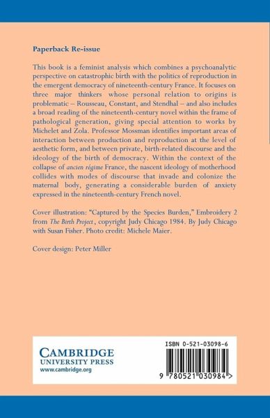 This book is a feminist analysis which combines a psychoanalytic perspective on catastrophic birth with the politics of reproduction in the emergent democracy of nineteenth-century France. It focuses on three major thinkers whose personal relation to origins is problematic, Rousseau, Constant and Stendhal, and also includes a broad reading of the nineteenth-century novel within the frame of pathological generation, giving special attention to works by Michelet and Zola. Professor Mossman identifies important areas of interaction between production and reproduction at the level of aesthetic form and between private, birth-related discourse and the ideology of the birth of democracy. Within the context of the collapse of Ancien Régime France, the nascent ideology of motherhood collides with modes of discourse that invade and colonize the maternal body, generating a considerable burden of anxiety expressed in the nineteenth-century French novel.