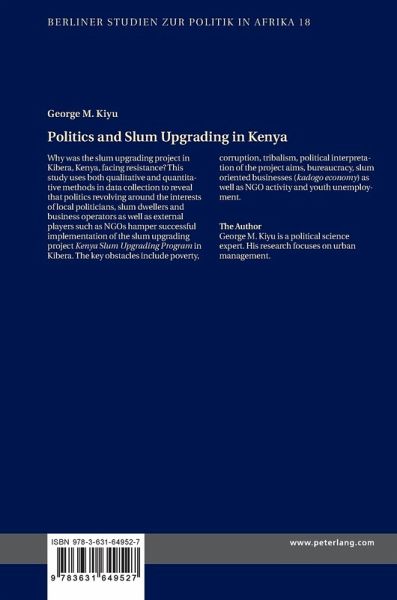 Why was the slum upgrading project in Kibera, Kenya, facing resistance? This study uses both qualitative and quantitative methods in data collection to reveal that politics revolving around the interests of local politicians, slum dwellers and business operators as well as external players such as NGOs hamper successful implementation of the slum upgrading project Kenya Slum Upgrading Program in Kibera. The key obstacles include poverty, corruption, tribalism, political interpretation of the project aims, bureaucracy, slum oriented businesses (kadogo economy) as well as NGO activity and youth unemployment.