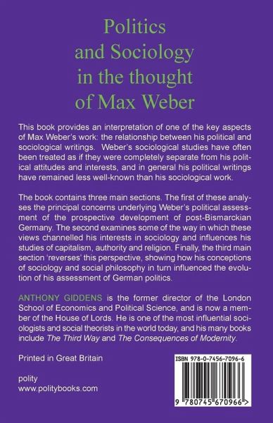 This book provides an interpretation of one of the key aspects of Max Weber's work: the relationship between his political and sociological writings. Weber's sociological studies have often been treated as if they were completely separate from his political attitudes and interests, and in general his political writings have remained less well-known than his sociological work. The book contains three main sections. The first of these analyses the principal concerns underlying Weber's political assessment of the prospective development of post-Bismarckian Germany. The second examines some of the way in which these views channelled his interests in sociology and influences his studies of capitalism, authority and religion. Finally, the third main section 'reverses' this perspective, showing how his conceptions of sociology and social philosophy in turn influenced the evolution of his assessment of German politics.