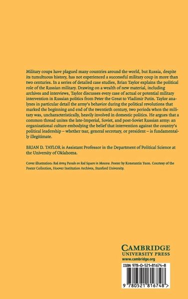 Military coups have plagued many countries around the world, but Russia, despite its tumultuous history, has not experienced a successful military coup in over two centuries. In a series of detailed case studies, Brian Taylor explains the political role of the Russian military. Drawing on a wealth of new material, including archives and interviews, Taylor discusses every case of actual or potential military intervention in Russian politics from Peter the Great to Vladimir Putin. Taylor analyzes in particular detail the army's behavior during the political revolutions that marked the beginning and end of the twentieth century, two periods when the military was, uncharacteristically, heavily involved in domestic politics. He argues that a common thread unites the late-Imperial, Soviet, and post-Soviet Russian army: an organizational culture that believes that intervention against the country's political leadership - whether tsar, general secretary, or president - is fundamentally illegitimate.